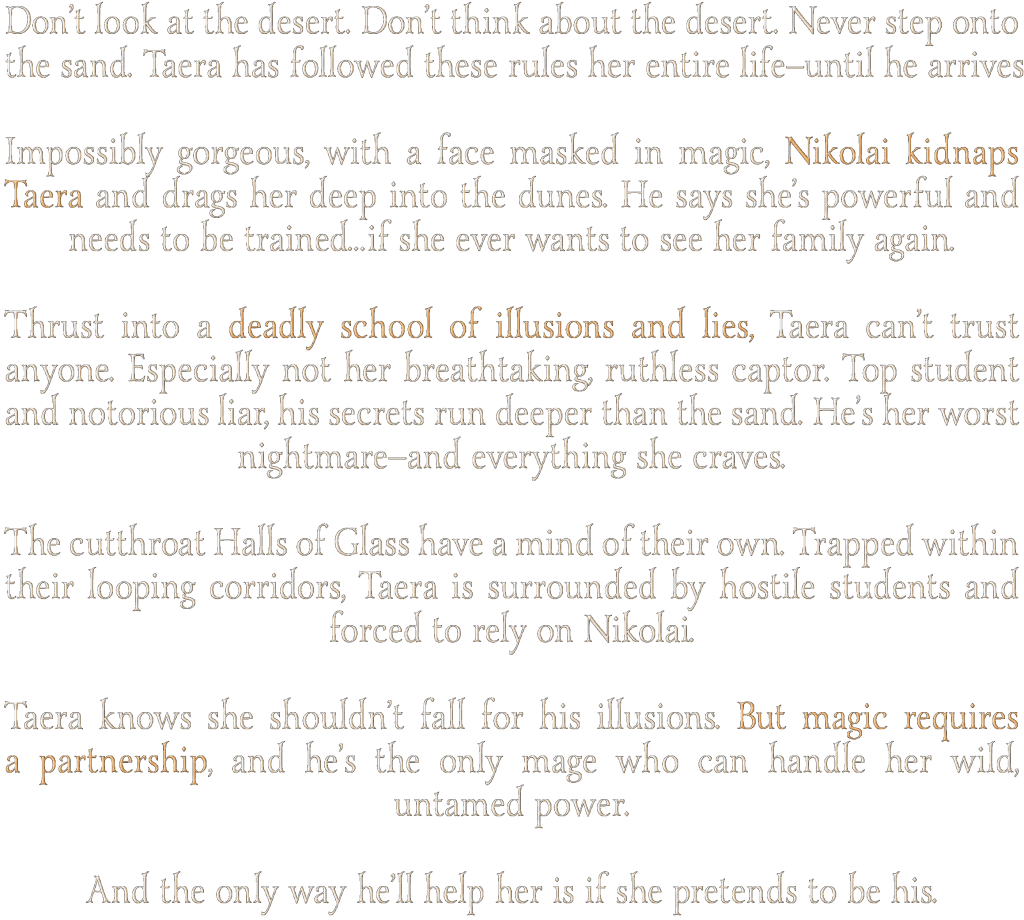 Thrust into a deadly school of illusions and lies, Taera can’t trust anyone. Especially not her breathtaking, ruthless captor. Top student and notorious liar, his secrets run deeper than the sand. He’s her worst nightmare—and everything she craves.