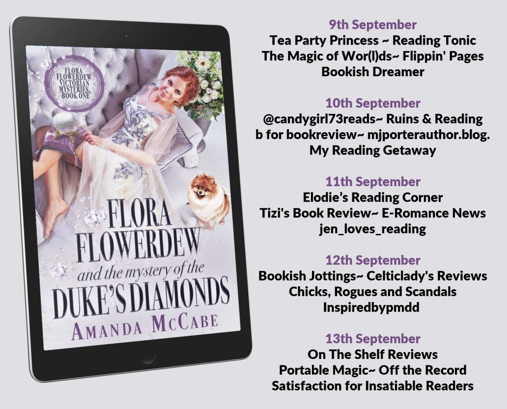 I wanted to read this book because, with a name like Flora Flowerdew, I just knew it was going to be humorous. While it didn’t turn out to be really laugh-out-loud humorous, it was still entertaining and I enjoyed the read. How could you not find a former showgirl who decides to be a ‘medium’, a Pomeranian who really does sense ghosts, a girl who wants to get out of a betrothal to a duke, and a duke whose family diamonds are missing – to be totally entertaining?